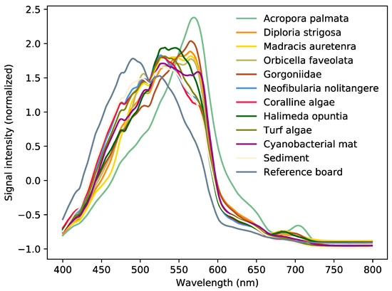 The normalized average spectrum shows the unique shapes and potentially distinguishing features of 12 different class labels. The average for each class label was calculated from all pixels annotated with that label across the dataset. These 12 labels provide a comparison between examples of labels occurring in the broader categories of corals, sponges, macroalgae and other habitat descriptors.