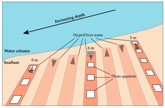 At each of these sites, the HyperDiver was used to survey a large area by capturing between 10 and 20 hyperspectral transects in total (Figure 4). The surveyed area was marked by laying out 50 m measuring tapes along the edges of the area. The seafloor area between depths ~3 m to 9 m was surveyed in a raster pattern at mostly constant seafloor depth. Of these transects, only three were chosen as comparative transects, where co-located color imagery was also captured. These comparative transects were at three different depths—3 m, 6 m, and 9 m.