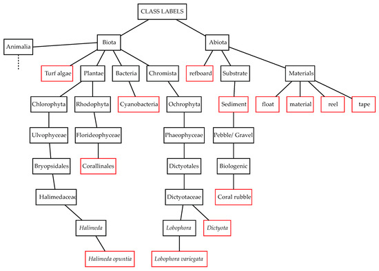Truncated tree schematic showing hierarchical nature of annotation labels was reconstructed from the unique identifiers from existing classification ontologies. Labels used for the annotated dataset are in red bounding boxes. Biotic labels were tagged with unique AFAID identifier from the World Register of Marine Species (WoRMS) database and abiotic labels were tagged with an identifier code from the Collaborative and Annotation Tools for Analysis of Marine Imagery and video (CATAMI) classification scheme. For the complete hierarchical tree that includes all labels under Kingdom Animalia, refer to Figure A1 in Appendix A.