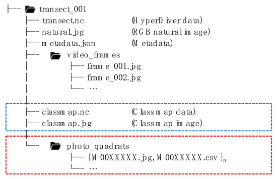 Data are organized into individual folders for each surveyed transect (transect_001 to transect_147). Every data folder contains HyperDiver data, a natural color image as well as extracted video frames. A subset of the transects will also contain additional files containing annotations of hyperspectral data (blue) and/or an additional sub-folder containing photo quadrat images (red).