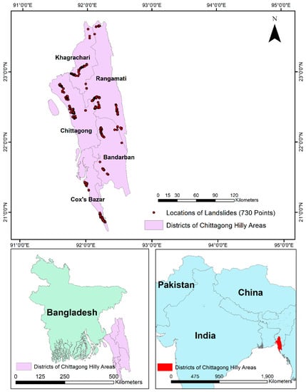 We used Google Earth to map landslides and record the data in remote areas, especially in the forests. Due to the remoteness, we did not validate each of the 230 landslides and so carried out the validation in the Bandarban district. We went to the locations of the landslides that we detected in Google Earth for the Bandarban district and verified whether landslides occurred there. We found that the overall accuracy of Google Earth mapping was 88%. This means that 88% of the landslides that we detected in Google Earth were landslides in the Bandarban district. The accuracy of the landslides identified in [12,16] are not known, but we can anticipate a very high accuracy as they used field mapping techniques.
