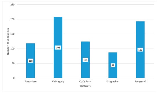 Number of landslides in different districts of the Chittagong Hilly Areas (CHA).