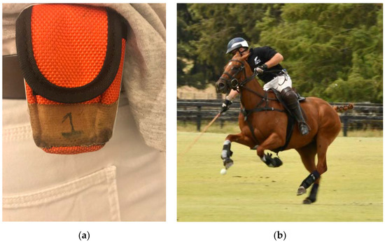 Data were collected using GPS devices (VX Sport 350, VX Sport, Lower Hutt, New Zealand) and heart rate monitors (Suunto Smart Sensor, Suunto, Vantaa, Finland), sampling and transmitting at 10 Hz and 2.4 Ghz, respectively. GPS devices were set to an equestrian mode with a customized range of 0–60 km/h as previously reported [2,3,4,10]. It is important to note that this does not limit recording ≤ 60 km/h, but sets a benchmark in the accompanying analysis software, for which, to scale the data, collected GPS devices were turned on upon arrival at the ground, to secure an initial ‘satellite lock’, and left to sample for 1–2 min, effectively registering the location for the sample, before being turned off until game sampling. Units were turned on ~45 min prior to games starting, and placed inside customized pouches, secured with electrical tape to prevent undue oscillation of the device during play. GPS devices were affixed to players’ belts in their customized pouches (as per Figure 1), with the corresponding paired heart rate monitors worn around players’ chests, with sampling electrodes positioned either side of a player’s sternum. Equipment was delivered to players ~30 min prior to games starting, to allow players to warm-up and undertake any preparatory routines without experimenter interference.