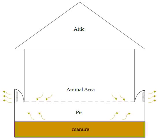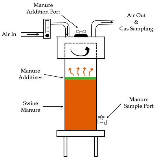 The United States is one of the top three pork-producing countries, and Iowa is the biggest pork-producing state. In Iowa, the most common structure for manure storage is a deep pit under a barn, as shown in Figure 1. The deep pit under the slatted floor often stores manure for a year, which is then applied as a fertilizer on the fields (in the fall after harvest). This commodity generates profits and jobs for local communities, but also generates odorous chemical gases that affect the air quality in the surrounding communities. These unwanted gaseous emissions are one of the biggest concerns in the pork industry. Ammonia (NH3) and hydrogen sulfide (H2S) are extremely harmful to the health of humans and animals, especially during the manure pump-out season. During this time, there is always news about people or livestock fainting, or fatalities due to exposure from NH3 and H2S []. Volatile organic compounds (VOCs) are the main generators of odor. Small particle matters in the air will carry these odorous VOCs miles away and affect the living environments of farming communities []. Greenhouse gases (GHG) will accumulate in the atmosphere and cause changes in the climate. The manure additive is one of many ways to potentially mitigate these emissions. It is considered to be relatively inexpensive compared with other methods and easy to apply without changing the swine farm’s current structures [].