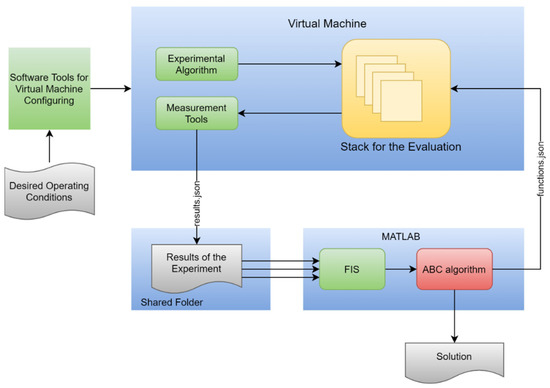 After the execution of the experimental algorithm, a json file, “results.json”, was generated. This contained the results of the experiment obtained through the interface of the Node.js “process” object which provided the measurement tools for the evaluation. These data were used as the input values for the FIS. The output value of the FIS was then considered by the ABC algorithm as the cost function for the food source corresponding to the stack that was experimentally evaluated.