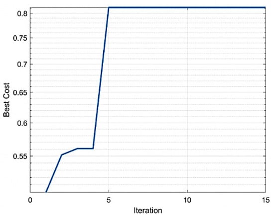 The ABC algorithm converged to the solution of Equation (2) after 15 iterations. The coordinates of the solution were [2 3 1 1 1 1 1 2 1 1], which corresponds to the following selection of components to meet the functional requirements: should be implemented with the component “Underscore”; and should be implemented with the JavaScript language tools; should be implemented with the component “Lodash”; should be implemented with the component “Path”; should be implemented with the component “Adm-zip”; should be implemented with the component “Hasha”; should be implemented with the component “Fs”; should be implemented with the component “Fs-extra”; should be implemented with the component “Recursive-readdir”. The FIS output for the solution was equal to 0.8123.