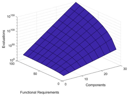 Extensive search combinatorial explosion for larger sets of functional requirements and components. The Z-axis is logarithmic base 10.