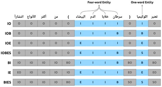 , which is translated as “Chronic Lymphocytic Leukemia,” the adjective chronic was considered part of the NE by the first annotator, while the second annotator decided to exclude it. In the NER literature, several well-known annotation schemes were used to perform the annotation task. We decided to annotate our dataset using seven frequently used annotation schemes, which are listed and described in Table 2.