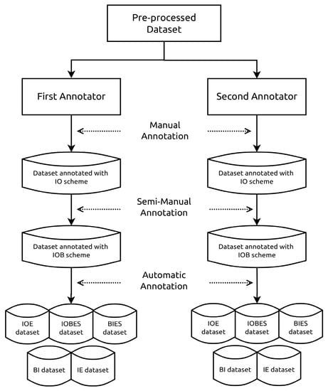 The process of annotating our datasets using the aforementioned schemes is illustrated in Figure 2. The annotation step was performed based on the preprocessed data. At the beginning, each annotator independently labeled the dataset manually using the IO annotation scheme due to its simplicity. However, the IO scheme cannot determine the boundaries of consecutive entities. Therefore, the data were annotated automatically using the IOB scheme except for the consecutive entities that the annotators marked manually. Afterwards, the annotation process was automatically performed for the rest of the schemes using a Python script especially developed for this purpose. The script relies on identifying the named entities boundaries to be able to generate the subsequent annotation schemes. Based on the specific rules designated for each annotation scheme, the script generates the required scheme. For example, the code listing shown in Listing 1 highlights some of the important rules and steps performed for generating the IOBES annotation scheme.