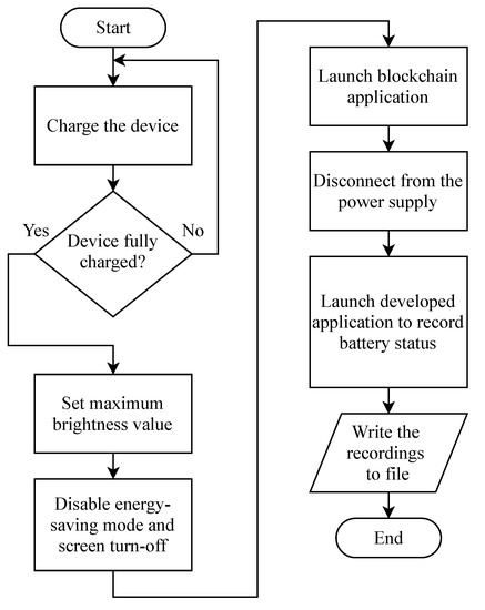 After the above conditions are met, the selected blockchain application is launched on the mobile device. It is necessary to ensure that the device has started to perform work, i.e., carry out activities, ensuring the blockchain functionality. Next, the developed application for recording the battery status is launched.