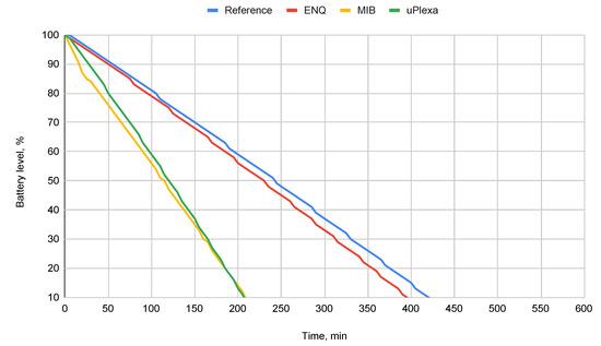 As can be observed in Figure 3, the PoA-based ENQ application speeds up the battery discharge only by 5%, while the battery discharge rate is doubled compared to the reference state for PoW-based solutions (MIB and uPlexa) reaching 45%. This difference can be explained by the fact that PoW algorithms are more computationally challenging for smartphones compared to PoA.