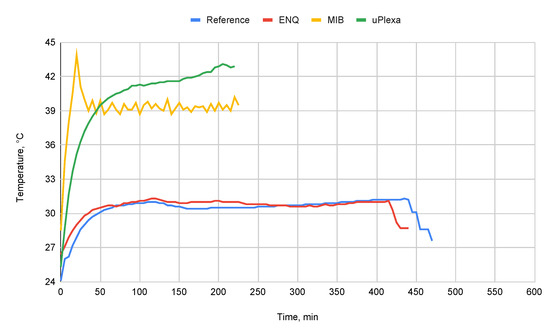 Following the point mentioned above, Figure 4 depicts a similar pattern for temperature change. The ENQ-PoA solution has almost no impact on the battery’s temperature, unlike PoW, where the temperature reaches 44 ଌ. This value can cause discomfort while using the device and unintended behavior and even damage to the smartphone.