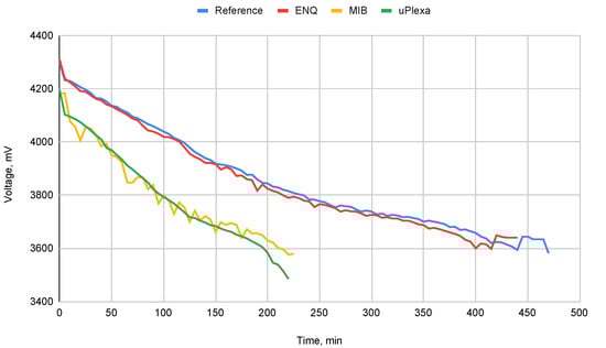 The graph depicted in Figure 5 indicates that the PoA blockchain application does not affect the battery output voltage of the device when compared to the reference state. It also demonstrates that the voltage drops a lot faster when PoW algorithms are active, which confirms the results derives from Figure 3.