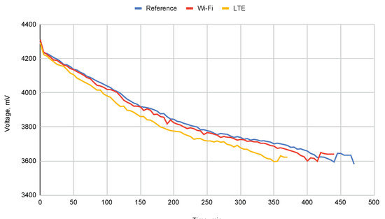 The graphs show that the cellular LTE technology has more negative impact than Wi-Fi. As explained above, the Wi-Fi impact on the battery level is about 5%; and when using a cellular connection, the discharge rate increases by 20% in comparison to a reference state, see Figure 6. More rapid battery use can also be seen in Figure 8, confirming the statement.