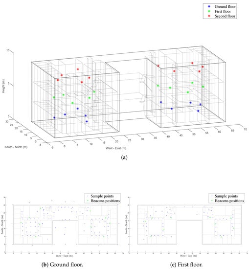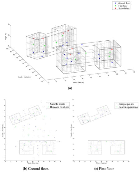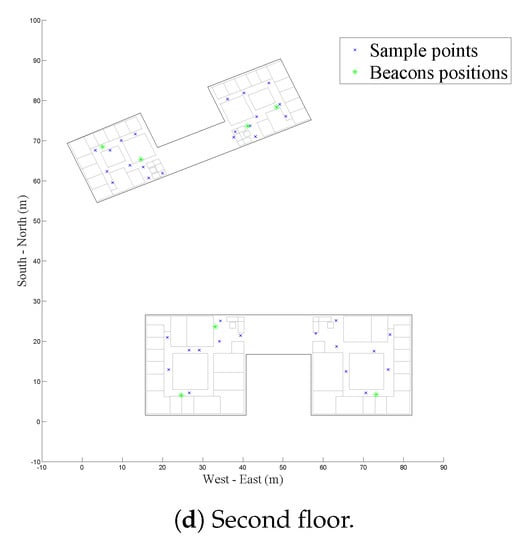 The quick growth of wireless communication networks has fostered new uses beyond simple information exchange. Among others, wireless networks can be used as a backing for applications that serve a certain task according to the user’s position. This kind of developments, known as Location-Based Services (LBSs), has grown exponentially in recent years because of its integration with smartphone devices []. The most extended technology for LBS is the Global Navigation Satellite System (GNSS), which can provide position accuracy within the order of meters [], high accuracy may be obtained with, for instance, Precise Point Positioning and augmentation services []. Despite its world-wide range, GNSS loses accuracy in complex environments, such as indoor scenarios, because of the physical barriers that the signal must go through []. Withal, of the daily time is spent on these environments [], and therefore, an alternative is needed to provide position estimations for LBS in indoor areas. Many technologies have been tested to build Local Positioning Systems (LPS). Among those are Ultrasound [,], Visible Light Communication (VLC) [] and radio-frequency networks, such as Radio-Frequency Identification (RFID) [], ZigBee [], Wi-Fi [], Bluetooth Low Energy (BLE) [] and Ultra Wide Band (UWB), []. Some of these, as the ultrasound and UWB, can provide centimeter precision, but need special hardware, increasing the price. A special group of technologies are those that are embedded in most off-the-shelf smartphones and hence do not need extra components on the receiver, like BLE and Wi-Fi.