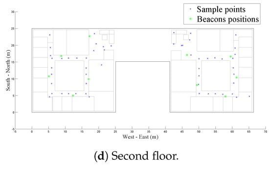 Mohammadi et al. [] present as a database the experimental tests carried out for their system based on a semi-supervised machine learning algorithm. A set of beacons was distributed using a regular grid in a university hall. A user with a smartphone and a custom application detected and stored the signals from each beacon. The environment was divided into cells following a regular grid, so that each cell could be identified from the indices that determine their row and column. The data is given as fingerprinted vectors with the missing values replaced by a constant value of dBm. Besides, another set of measures, much more numerous, but not labeled, is also provided. These data are used for the development of the semi-supervised learning algorithm. Regardless of the tag, each one has, in addition to the RSSI of each beacon, the timestamp of the fingerprint. The iBeacon protocol was used although the specific hardware for the BLE beacons is not specified in the work.
