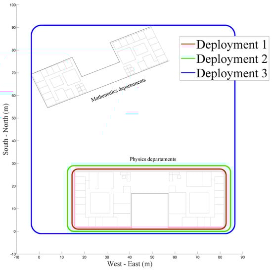 All the experiments were performed in the buildings of the Physics and Mathematics departments of the Faculty of Science at the University of Extremadura, on its campus in Badajoz, Spain. Three different deployments were made at these locations, varying in each one the position as well as number of reference points, and the area covered by the system, as shown in Table 3.