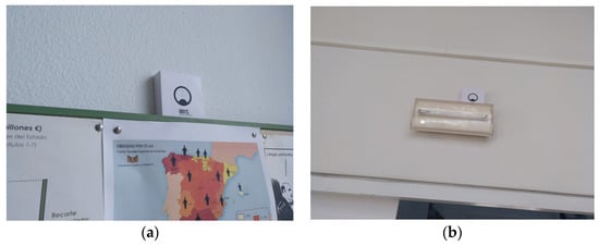 The beacons used in this work were the IBKs Plus from Accent System [] with a Nordic Semiconductor nRF51822 chipset controller []. We chose them because they could simultaneously broadcast up to six different signals, with two individually configurable slots following iBeacon®protocol and four slots following Eddystone®protocol. The configurable parameters were the advertising period, the identification code, the emission power, and a calibration factor. The identification code was implemented differently in both protocols. iBeacon®had three distinct identification elements: the Unique Universal Identifier (UUID), a 128-bit hexadecimal code, and two unsigned 256-bit integer values known as major and minor numbers. Usually, the same UUID was used within all the beacons in a system and the major and minor are used to differentiate between elements. Eddystone®had different versions according to what kind of information is being broadcast. The simplest version used a Unique Identifier (UID), which is a unique 16-byte hexadecimal code, to distinguish between beacons. Other versions of the protocol were designed to transmit specific data, such as a Uniform Resource Locator (URL) or sensor and telemetry information, but all of them used the same UIDs for source identification. Aside, all slots within a beacon shared the same media access control address (MAC), which was defined by the BLE protocol. In this work, the UUID and the UID were used to characterize each slot following a custom-defined format. The emission period was set to 200 ms for all the slots, and the calibration was left with its default value. The transmission power was configured differently for each slot as shown in Table 2, but following the same pattern in all the beacons.