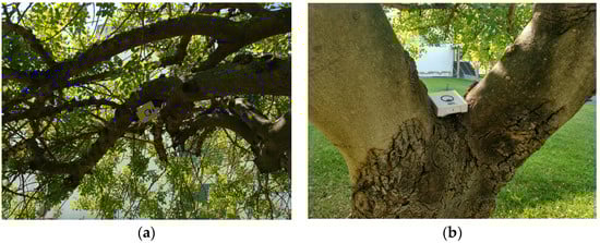 The first deployment is focused on the Physics department buildings. These were shaped by two cubic structures joined by a walkway on the first floor. The second deployment was an extension appending new RP outside the buildings and new levels in specific locations inside. The last deployment extended the scheme to cover the buildings of both the Physics and Mathematics departments, as well as the space in between. A scheme of this scenario is depicted in Figure 1, where subfigure (a) shows a 3D view of the environment used in the first two deployments with the beacon locations using a different color for each floor. Subfigures (b)–(c) shows the drawing of each floor with the beacons location in green and the sample points in blue. Beacon positions for the first two deployments were the same but the sample points depicted were the ones used in the second deployment. In Figure 1 a scheme of the environment used in the last deployment is shown following the same criteria Figure 2. In Figure 3 the region of each deployment is shown. Examples of the beacons in the indoor and outdoor sections are shown in Figure 4 and Figure 5, respectively. For each deployment, a user moved through all the RP with a smartphone, starting the measurement once the user is on the reference point that is selected in the application. Measurements lasted 30 seconds and the user’s orientation was changed to match four orientations (north, south, west, and east) during the collection procedure. The collection procedure could have been done with the user in motion instead of statically. This would have add a new dimension to the positioning system, taking into account tracking and navigation features that are out of the scope of this work. Three different smartphones were used: a BQ Aquaris, a Samsung Galaxy S6, and Xiaomi M8, hereinafter BQ, S6 and M8 respectively. A different user held each phone during the collection procedure. Measurements were done without following a particular order and during holiday time to ensure that the environment had low presence of people.