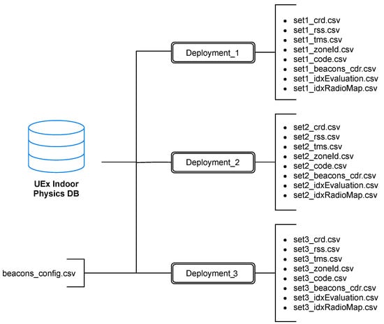 The database and the supplementary material are available at []. The different deployments presented in the previous section are treated as independent databases, following the same structure for all of them. Each dataset is presented as a set of eight CSV files: RSSI values, positions, timestamps, identification codes, and training and test indexes. A scheme of each data set structure is shown in Figure 6. These files have the same number of rows, which is determined by the number of different measurements in each deployment.