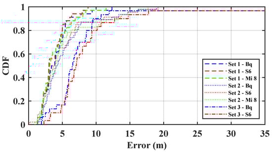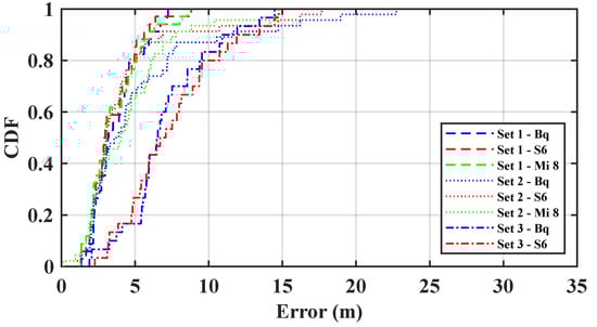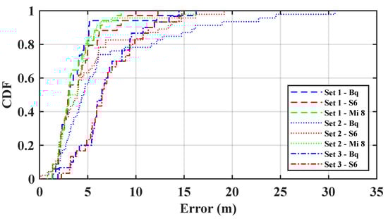 One of the features of this database is the use of more than one emission slot for each beacon, i.e., each hardware device is broadcasting different signals at the same time. The 1-NN algorithm is used as positioning algorithm considering all different slots as different beacons; therefore, the fingerprinting vector has length of 180 samples. For this indoor positioning application, the data have been divided between training and test subsets, using 20% of the data for test and 20% for training. The Cumulative Distribution Function (CDF) of the error in the test samples is shown in Figure 7 for each phone (BQ, S6 and MI 8) and each deployment set. Some statistical parameters of the error distribution, such as the mean value, the median (percentile), the percentile and the floor detection rate are shown in Table 4 whose last column also shows the Tag ID recognition rate.