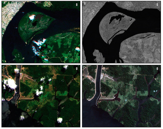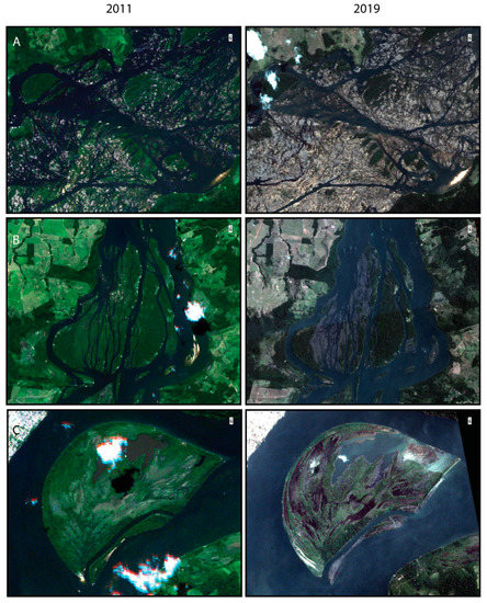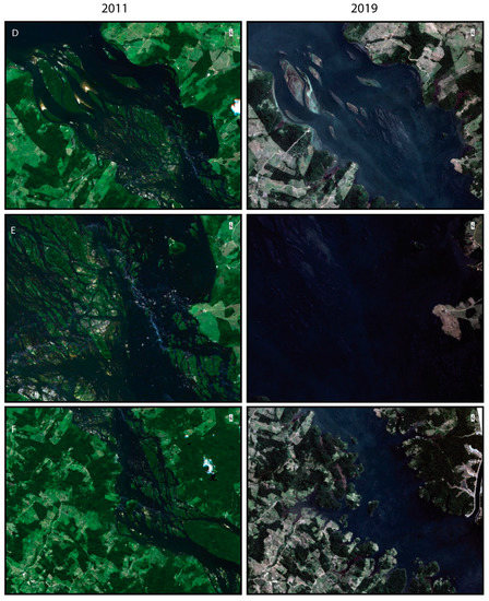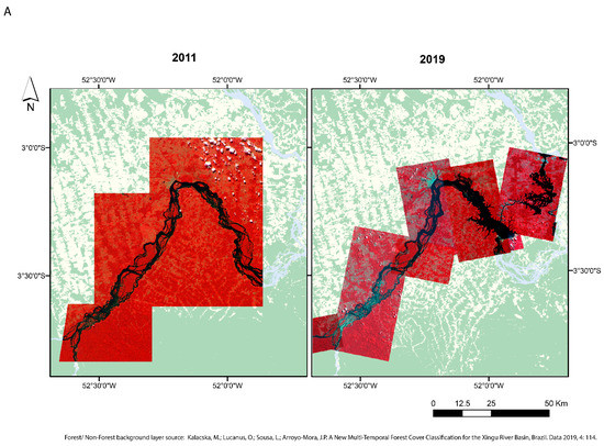 Furthermore, it is important to take into consideration the highly seasonal water flow and the natural flood pulse of the river. The river has four hydrological periods, low water (September–November), flooding (December–February), high water (March–May) and receding water (June-August) [25], with discharge rates ranging from, on average, ~2000 m3/s in October to ~21,000 m3/s in April [8]. It has one of the highest annual variations in flow of all Amazon tributaries. The imagery from 2011 (4 July) is earlier in the receding period than that of 2019 (11–24 August) due to the availability of imagery with minimal cloud cover for the entire area. There is an approximate 1000 m3/s difference in discharge between July and August [8]. The effect of this difference can be seen in the southern sector of the data near the confluence of the Iriri river, outside the impact zone of the reservoir. In Figure 2A, for example, the higher water level is seen in the RapidEye imagery from 2011 in comparison to the PlanetScope image from 2019, where there is a larger amount of rock exposed in the channels. With continuous acquisition of daily revisit satellite imagery, over time it may be possible to acquire minimal cloud cover imagery for the high water periods as well, providing a more thorough assessment of the seasonal extents of the river.