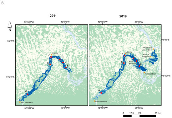 Points of comparison between the 2011 and 2019 satellite imagery. In (A), the difference in water level is attributed to yearly and seasonal differences in flow. The 2019 imagery was acquired later in the dry season (August) than the 2011 imagery (July). This area near the confluence with the Iriri river is outside of the influence of the main reservoir. Both (B) and (C) are within the range of the impacts of the main reservoir. A higher water level and clearing of vegetation from the islands can be seen in 2019 in comparison to 2011 (B,C). These comparisons are downstream of Altamira in the sector of the river with the greatest change caused by the main reservoir of the Pimental dam. Many islands can be seen in 2011 (D–F) which are underwater in 2019. In F, the intake for the canal can be seen on the eastern side of the image from 2019.
