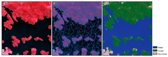 (A) Example of a NIR/Red/Green false color composite of a part of PS scene 132,531 (2019) from the artificial reservoir. (B) Outlines of the segments from the same image as shown in (A). (C) Final GEOBIA classification of the segments into water, forest, and non-forest classes.