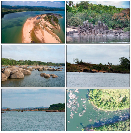 Field photos from the zone impacted by the reservoir at the boundary of the pre-Cambrian Complex of the Xingu and the Amazon Sedimentary Basin (see [24] for a description of the geology of the region). The rock formations differ in this sector compared to Figure 6. Cleared islands with flooding and flooded forest (vegetation not cleared prior to flooding) from within the reservoir near the Pimental dam can also be seen.