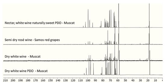 - Mannu, A.; Karabagias, I.K.; Di Pietro, M.E.; Baldino, S.; Karabagias, V.K.; Badeka, A.V. 13C NMR-Based Chemical Fingerprint for the Varietal and Geographical Discrimination of Wines. Foods 2020, 9, 1040. [Google Scholar] [CrossRef] [PubMed]