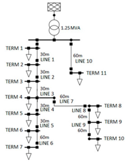 - The combined scenarios built in previous sections were fed into a benchmark grid designed in DigSiloent PowerFactory with the network line parameters specified in Table 1, the consumption demographics specified in Table 2 and the network diagram specified in Figure 1.