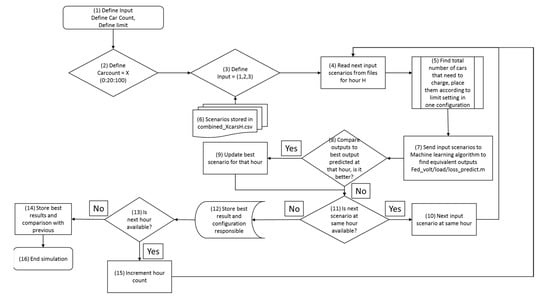 The values for carcount are varied between 0 and 100 in increments of 20. Input, as defined in block 3, refers to 1: line loading, 2: voltage drop and 3: line losses optimization functions respectively. The functions are called accordingly in block 7, which is done via the code files “machinelearning_X.m”, where X can refer to loading, volts or losses. These files also contain the code snippets responsible for comparing the outputs from block 7 with best recorded outputs at that hour, which are later stored in block 14. This is achieved by storing the input configuration corresponding to the least costly output observed when the relevant neural network is called.
