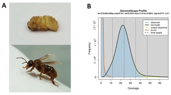 Genome size estimation of Malaysian stingless bee, H. itama. (A) Photograph of a queen pupa (unpigmented) and newly emerged queen of H. itama (slightly pigmented). (B) 21-mer GenomeScope profile showed the predicted genome size with other matrices for genome profiling.