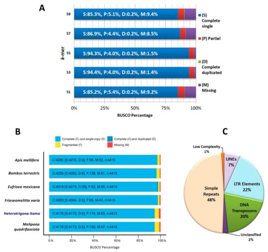 Genome assembly and structural annotation. (A) Benchmarking Universal Single Copy Orthologs (BUSCO) assessment based on different k-mer (51- to 59-mer). (B) Benchmarking Universal Single Copy Orthologs (BUSCO) assessment for six different bee species including the H. itama assembled in this study. (C) Repeat elements of the draft genome.