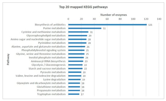 Distribution of the top twenty Kyoto Encyclopedia of Genes and Genomes (KEGG) pathways mapped with the most number of enzymes through KEGG pathway analysis.
