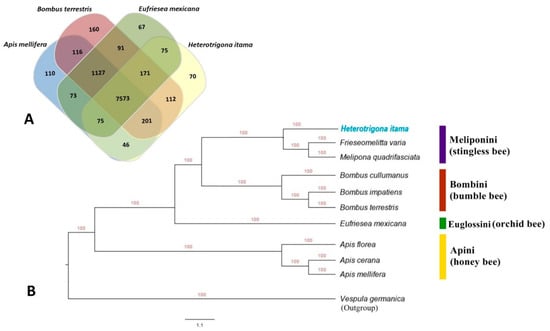 Orthologous and phylogenetic analysis. (A) Venn diagram of orthologous gene clusters between four extant representative members (Apini, Bombini, Euglossini and Meliponini) of the bee clade Corbiculata including H. itama. (B) Bayesian inference (BI) tree obtained for ten bee species based on 39 conserved single-copy orthologs rooted on Vespula germanica (branches transformed proportionally; posterior probability (%) labeled; species names labeled at tips).