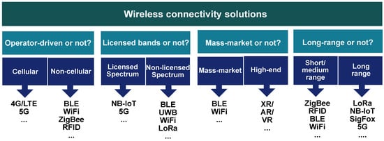 - Mass-market versus high-end connectivity solutions: a mass-market solution typically has low cost, low energy/power consumption, and it is affordable to the mass-market consumers. High-end connectivity solutions such as those relying on Augmented Reality (AR), Virtual Reality (VR), or Mixed Reality (XR) and, sometimes, on machine learning, are unlikely to become relevant promptly in the context of contact tracing and user tracking, as they aim at a narrow or niche market. They are unlikely to be adopted on a large scale (usually due to high costs). A good review of low-end, middle-end, and high-end IoT devices can be found in [50].