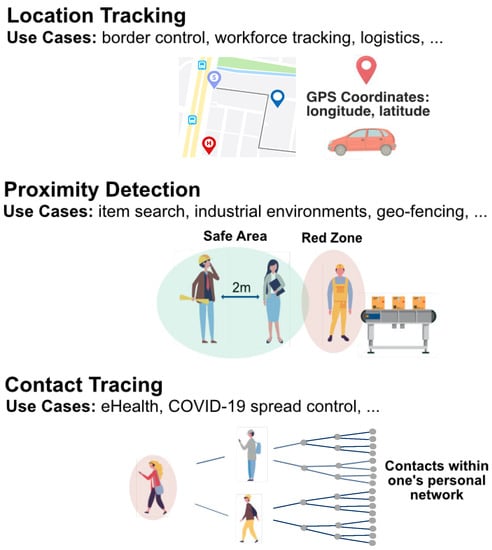 - Long-range versus short-range connectivity: long-range connectivity such as cellular solutions and some IoT solutions refer to coverage ranges of several hundreds of meters to few or tens of km [48]. Short-to-medium range connectivity typically refers to ranges of up to a few tens of meters. On one hand, in terms of user tracking, proximity detection, and contact tracing, a short coverage area could mean a better accuracy of the distance estimates between any two users. On the other hand, if a user needs to connect to a server to upload or download data related to its own location, a long-range connectivity solution is typically needed to be present on the user device. Relevant reviews of long-range connectivity solutions are provided in [48,51], where the focus is on IoT solutions. Short-range communications are reviewed in multiple studies, such as [52] with focus on near-field communications, [53] with focus on Bluetooth and BLE, then the study in [54] with focus on Ultra Wide Band (UWB) communications, and [48] with focus on general IoT solutions.