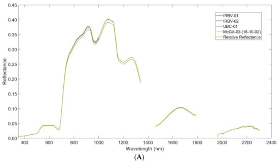 Field spectroscopy has long played a key role in the collection of spectral information used for a broad range of remote sensing studies [1,2,3]. Surface reflectance data have applications in multiple disciplines, such as forestry [4], agriculture [5], mining [6], calibration and validation [3,7], and many others. Solar-reflective spectroscopy data (i.e., near ultraviolet to shortwave infrared) from portable field spectrometers contain detailed information regarding the physical properties and chemical composition of materials. The measured reflected energy (in digital numbers or units of radiance) is influenced by illumination conditions, and can vary substantially over the course of a day due to changes in solar position and/or atmospheric conditions. In Earth observation applications within this spectral range, the fundamental property of interest is the spectral reflectance of a target or material of interest. In its most basic form, it is the ratio of incident-to-reflected radiance over a set of wavelengths (Rratio, also referred to as the relative reflectance) and is a unique property of a given target [8]. Many studies utilize the Rratio as directly calculated by the instrument. However, doing so causes substantial challenges in making valid comparisons of spectra of the same material over time and spectra acquired at different locations or by different instruments or reference targets. As described by [2], the generation of Rratio requires a second surface, the reference panel, to be used as a bright (approaching 100% reflectance), theoretically Lambertian (i.e., diffuse) target with which the ratio is calculated. As such, the spectral and angular properties of the reference panel directly affect Rratio. The absolute spectral reflectance of a material (Rabs), in contrast, is independent of illumination intensity or conditions. Rabs is therefore the suggested metric allowing comparison of spectra even if collected by different sensors, acquired under different conditions (e.g., time, location, orientation) [8], or with different reference panels.