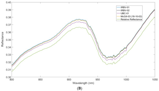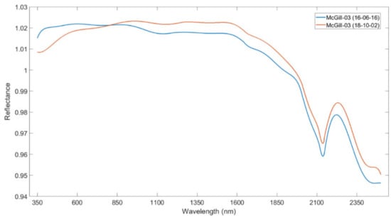 The ASD FieldSpec spectrometers have known spectral discontinuities originating from multiple potential sources [19,25,26,27] and may result in spectral “steps” in the reflectance values at the wavelength thresholds between the three internal spectrometers, namely, 1000 nm and 1800 nm. Certain conditions may cause these discontinuities to become more or less pronounced. The VNIR fiber bundle has a slightly broader FOV than those of the two SWIR instruments (see Figure 4 in [27]). Therefore, one of the most common causes for the discontinuities in the reflectance is due to shading differences between the VNIR and SWIR data, leading to differences in the radiance measured by each detector [19]. Excessive discontinuities are due to other factors such as use of the instrument prior to achieving thermal stability following power on, which can be of significant duration (an hour or longer) under extreme and rapid temperature changes. The use of a lens to reduce the FOV with heterogeneous or specular targets can also result in exaggerated discontinuities. ViewSpecPro contains an option for a “parabolic correction” to mitigate these discontinuities [19]. If it is not applied, a processing option is included in this toolkit to apply a “discontinuity correction” to the data [28]. It is important to note that the calculation of the discontinuity correction solutions performed by the toolkit is based on estimating the gradient between the edges of the discontinuity and calculating an additive and multiplicative solution to blend the two edges of the discontinuity together, rather than calculating a solution based on a specific empirical model. If the discontinuity correction option is selected, these solutions are provided in additional files separate from the original processed spectra so that the user can evaluate the results.