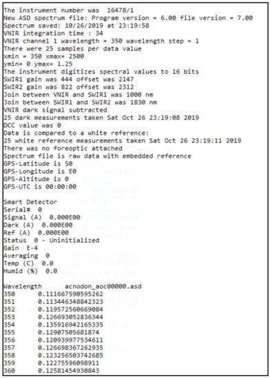 The input format requires ASCII files in which the dark-current-corrected signals in DN have been processed to Rratio. The ASCII file is expected to contain the standard ASD acquisition header information followed by a single spectrum organized as two tab-delimited columns, with the first column containing the wavelength and the second the value of Rratio (Figure 3). A straightforward way to generate these input files is through the freely available software ViewSpecPro, which can be downloaded from Malvern Panalytical [21]. If using ViewSpecPro to generate the input files, they need to be processed using the “ASCII export” option with “Reflectance” selected as the output data format. A detailed user guide on how to correctly pre-process the ASD data files in ViewSpecPro is included with the documentation bundled with the ASDToolkit [22].