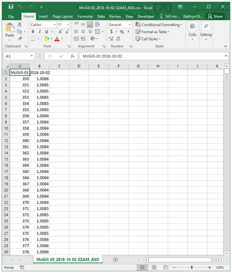 Example of the expected format of an ASCII file for input to the toolkit. Only wavelengths 350–360 nm are shown. This file of Rratio was generated in ViewSpecPro.