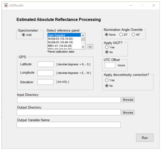 The ASDToolkit user interface (Figure 5) consists of a graphical user interface (GUI) with one main window where the user selects the inputs and processing options. Inputs may be supplied to the appropriate fields in any order; however, all input fields are required. Upon launching the ASDToolkit executable, the user is presented with the main interface window. There are several options for processing Rratio files, including multiple selection choices for the reference panel to use, an option to apply an incident angle correction factor (IACF) to account for the time offset between collection of the reference measurement and target measurements (calculated from the embedded time stamp and provided location coordinates), an option to apply a spectral discontinuity correction at the cross-over wavelengths between the three spectrometers (i.e., 1000 and 1800 nm), and options to override the illumination conditions using two common lab-based illumination and viewing geometries. These options and necessary inputs are described in detail below.