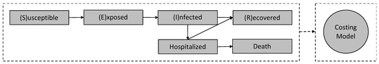 We followed the approach of Goh et al. [7] and modified a Susceptible-Exposed-Infected-Recovered (SEIR) compartmental model accounting for the spread of COVID-19 infection during the latent period. Applying a 1-year time horizon analysis, the model considered 4 compartments: S, E, I, and R for the number of susceptible, exposed, infected, and recovered individuals, respectively. Individuals who are exposed (E) have had contact with an infected person but are not infectious. The dynamics of this model were characterized by a set of 4 different equations that correspond to the stage of the disease’s progression: