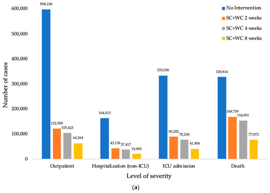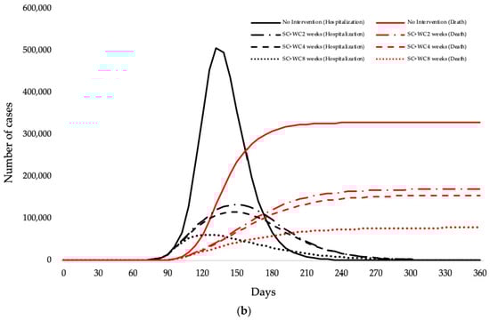 At the baseline (no intervention), we estimated that the number of outpatients, hospitalizations, ICU admissions, and deaths would be 598,198, 164,013, 335,036, and 328,814, respectively, in a 1-year time horizon. The baseline scenario resulted in the highest number of cases, which was expected. The scenario of SC + WC for 8 weeks yielded the lowest number of cases, confirming that the number of outpatients, hospitalizations, ICU admissions, and deaths would be 64,264, 19,993, 41,806, and 77,972, respectively. More detailed information about the number of cases among mitigation scenarios by level of severity can be seen in Figure 2a. To give an idea about the impact of SC and WC on reducing hospitalization cases and lowering the peak of mortality rate, we presented this in Figure 2b. The results showed that scenario of SC + WC for 8 weeks would give the highest impact compared with other scenarios.