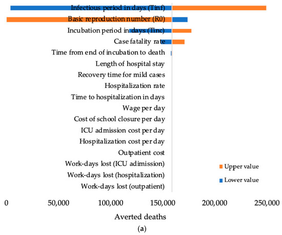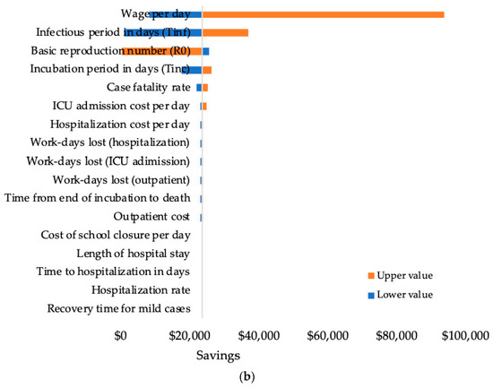 Our results indicated that all the mitigation scenarios were considered to be cost-saving since the interventions are more effective and less costly. In comparison with the baseline, the total savings in scenarios of SC + WC for 2, 4, and 8 weeks would be approximately $24 billion, $25 billion, and $34 billion, respectively. In addition, increasing the duration of SC and WC would increase the effectiveness of the intervention. Scenarios of SC + WC for 2, 4, and 8 weeks would result in approximately 159,075, 173,963, and 250,842 averted deaths, respectively. The result of this study is in line with the results of two previous studies [24,25]. Although not cost-saving, a study by Mao et al. on the cost-effectiveness of WC and travel restriction for mitigating an influenza outbreak mentioned that WC is a cost-effective choice and is particularly useful when specific pharmaceutical treatments are not available in a new disease pandemic [24]. Another study by Milne et al. also highlighted that a rigorous and sustained social distancing intervention is cost-effective for mitigating illness and death due to pandemic influenza [25]. Sensitivity analysis results also confirmed the results from several previous studies [6,26], which showed that the wage per day, infectious period, basic reproduction number, incubation period, and case fatality rate were found to be the most influential parameters affecting the savings and the number of averted deaths in a study for mitigating a pandemic situation. Wage per day is strongly associated with productivity loss [6]. Additionally, the infectious period, basic reproduction number, incubation period, and case fatality rate significantly affect the peak time, peak infected proportion, and total attack rate [26].