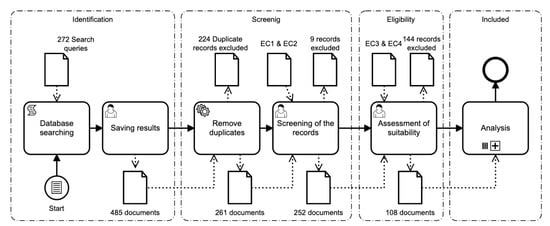 For data collection, we used an advanced search in the WOS database. We compiled the appropriate number of search queries for each medical specialization. The raw format is: TS = (BPMN AND “Medical specialization from Table A1”). We further examined the documents to see that they did not meet exclusion criteria EC1–EC4, following the procedure proposed by Kitchenham [] and according to the Preferred Reporting Items for Systematic Controls and Meta-Analyses (PRISMA) []. At least one disqualification response was required to exclude a study record. In case of doubt or inconsistency, the final decision was made by the principal author of this publication. Detailed phases, including quantifiers, were presented in the thematically adapted PRISMA flowchart in Figure 1.