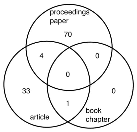 In the introduction, we divided the analyzed sample of publications according to their type. We processed the data into a Venn diagram in the Figure 3 because there was an overlap of types. The resulting values correspond to the essence of the WOS database. The number of publications from conference outputs still predominates, but this predominance is less than 2:1. This figure represents a Venn diagram of the corresponding groups and their intersections: Documents belong to three groups or a combination thereof. These are Articles, Proceedings Papers, and Book Chapters. Most documents belong to the Proceedings Paper group (70), and the second place went to documents marked as Articles (33). The other two groups are combinations, i.e., subsets of Articles-Proceedings Papers with four papers and Articles-Book Chapters with one document.