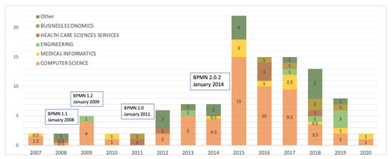 Figure 4 shows the progression and trends of annual scientific production of scholarly publications from 2007 to 2020 with BPMN version milestones. The year 2007 is discussed above and corresponds to the statement of the official BPMN 1.0 by the OMG. The upgrade from BPMN version 1.2 to 2.0 meant greater user friendliness and higher usability. This statement is evident from the slight increase in the number of BPMN concepts published in 2012. The most recent version, 2.0.2, which is, in the authors’ opinion, the most user friendly—even although it also has its mistakes—has brought a new wave of publications since 2015.
