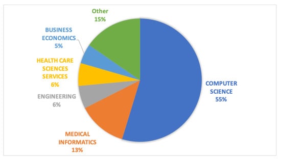 At the same time, we divided the documents according to the research areas defined by Clarivate Analytics in Figure 5. Each article can belong to more than one research area. In the text, we also present both values: total and (relative affiliation). The largest group consists of publications included in the research area of computer science. In total, we identified 64 (59.5) papers in this area. Eighteen documents belong to the “Other” group, and fifteen (11) belong to the Medical Informatics group. Seven publications belong to the group of Engineering and Health Care Sciences Services (6.5). The last group, Business Economics, contains six documents.